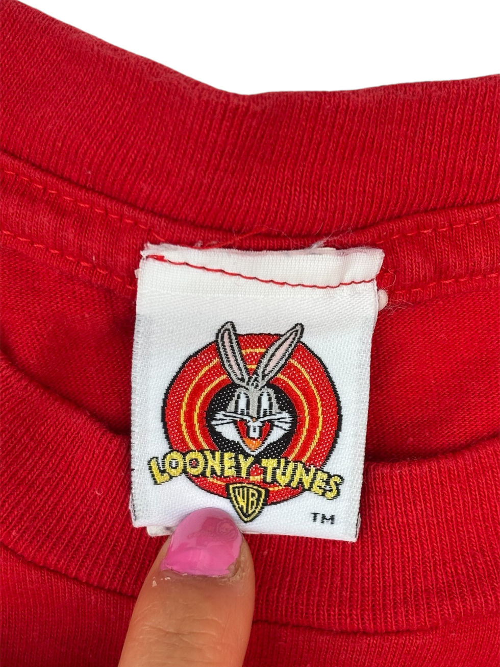 鮮やかなレッドボディに、ルーニー・テューンズの人気キャラクターが大胆プリントされた一枚。
