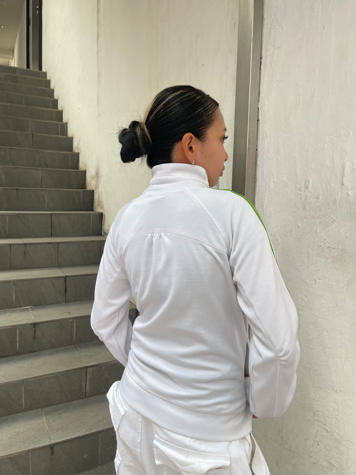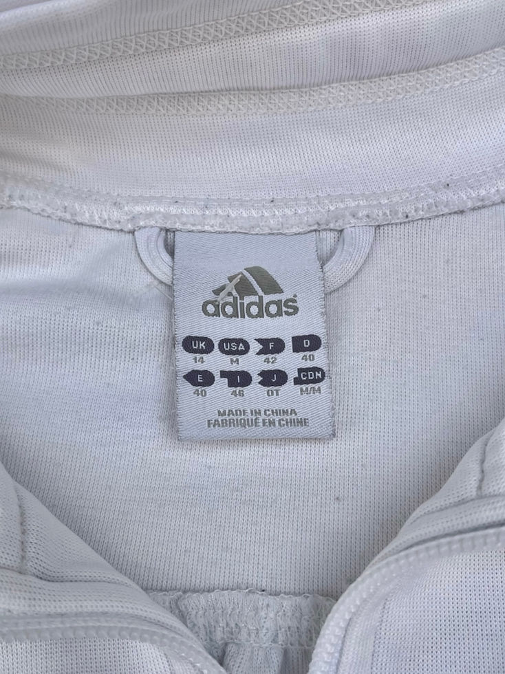 2000年代中期に登場したadidas「my stripes」コレクションのヴィンテージ・トラックジャケット。清涼感のあるホワイトをベースに、鮮やかなグリーンの3本ラインと縦向きのビッグロゴが映える一枚です。フロントジップや裾部分には「my stripes」タグが付属しており、当時の遊び心あるデザインが象徴的。Y2Kムードを感じさせるスポーティーかつ個性的なアイテムで、ストリートスタイルやコレクションにもおすすめです。