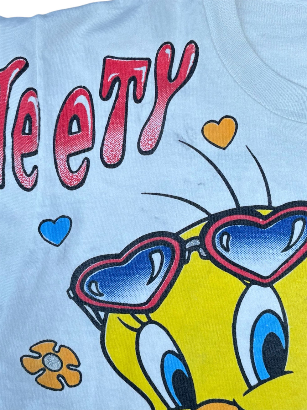 “TWEETY COOL”のメッセージとハートやフラワーの総柄デザインが当時らしい一枚。