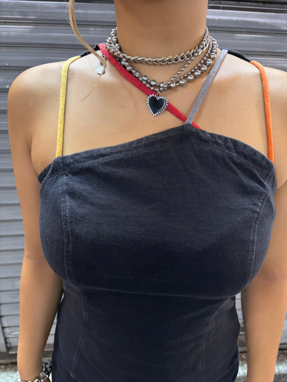 黒地の一見シンプルに見えるドレスですが、肩紐が不揃いだったり背中に丸がカットされているデザインで、Pygmeesらしいユニークな一点。