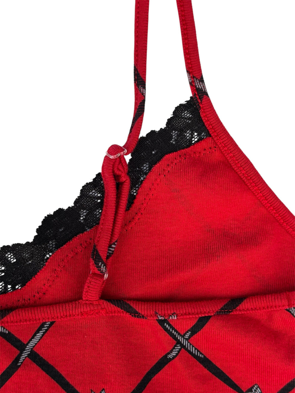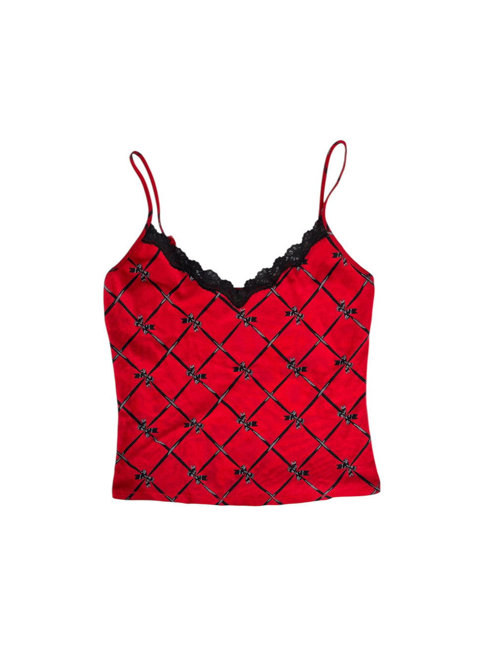 リボンの総柄デザインが特徴的なキャミソール。自然に身体のラインにフィットするサイズ感です。また、肩紐はアジャスター付きで調節可能です。