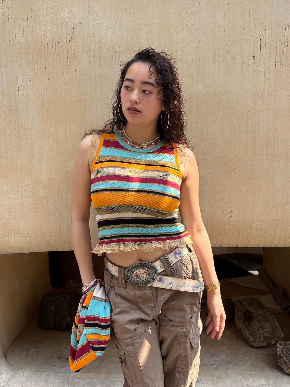 タンクトップとカーディガンがセットになっているアイテムです。Moschino Jeansらしいポップな色使いでコーディネートの主役になります。合わせるアイテムによってフォーマルにもカジュアルにも着回せます。