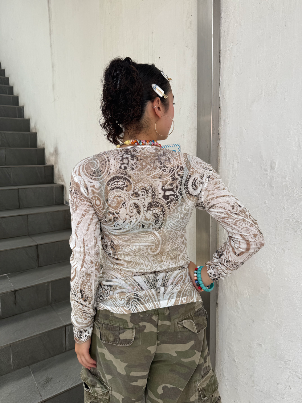ペイズリー柄をベースに、首元にビジュー&スパンコール装飾を施したロングスリーブトップス。