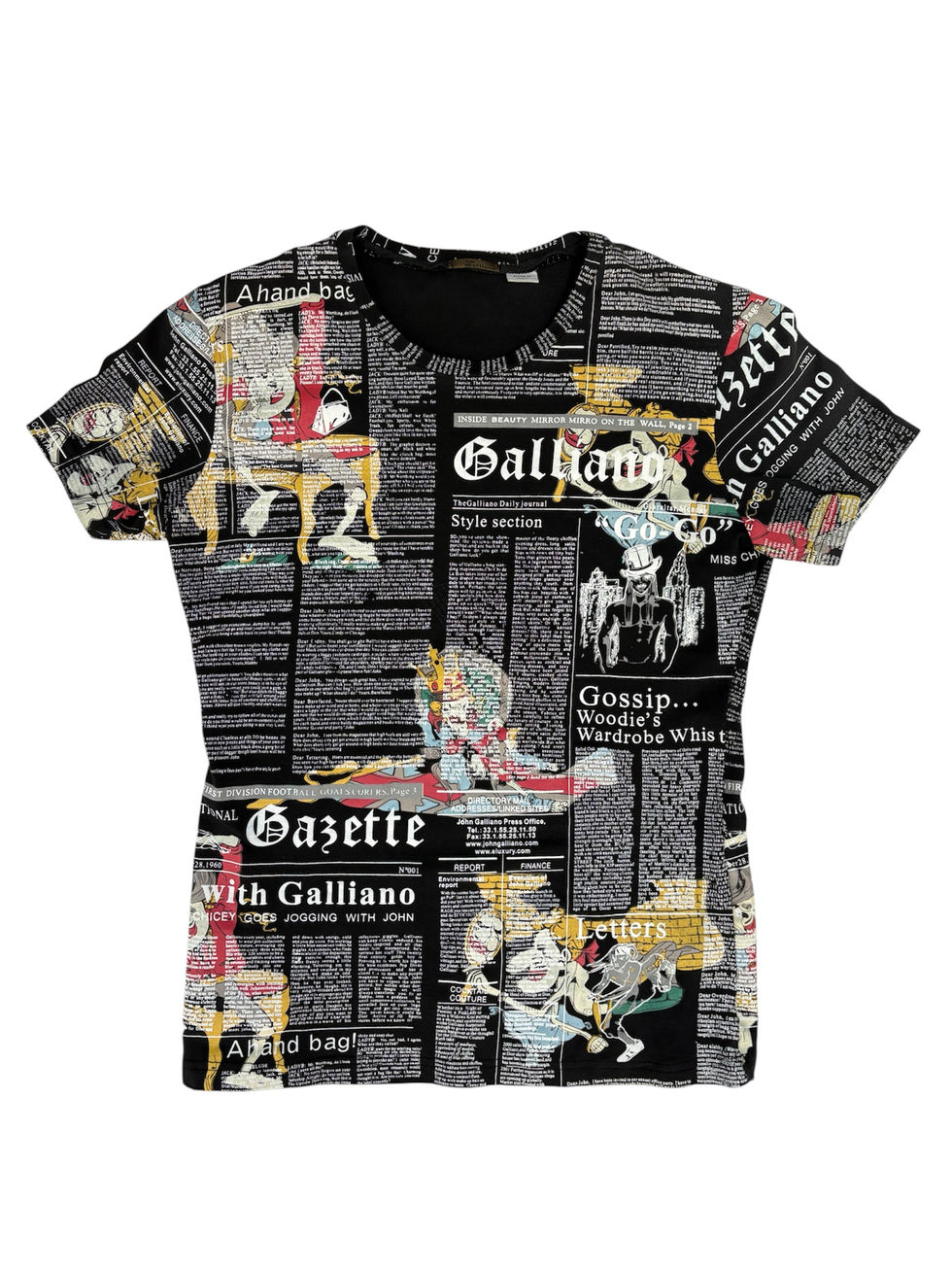 GALLIANOはジョン・ガリアーノが手掛けたブランドで、90〜2000年代にかけて大胆で独創的なデザインで注目を集め、特にニュースペーパープリントはブランドを象徴する代表的なモチーフとして知られています。こちらは2000年代に登場した新聞柄Tシャツで、全面にプリントされたニュースペーパー風デザインにカラフルなイラストを組み合わせたインパクトある一枚です。