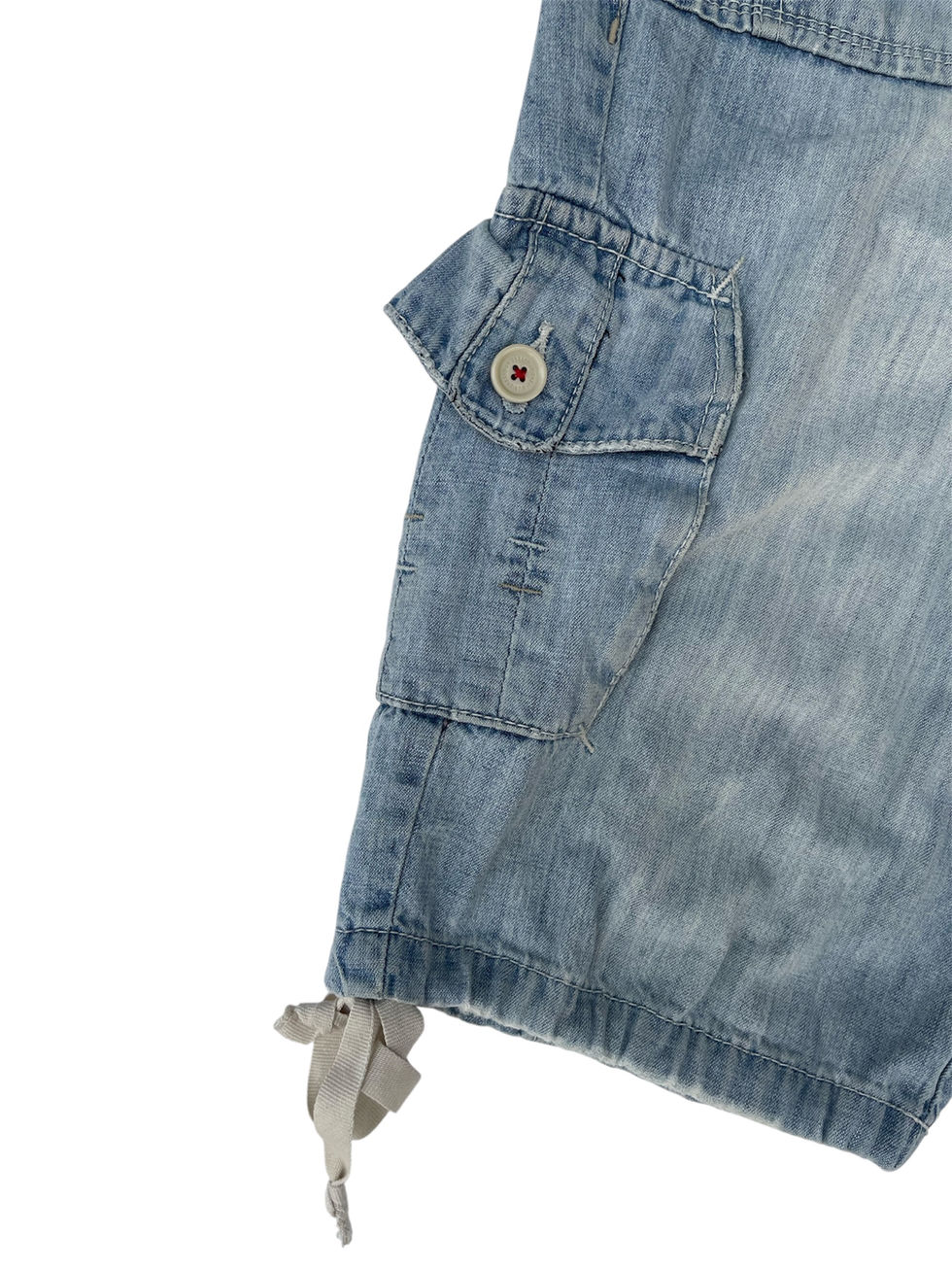 ライトウォッシュの風合いに、ポケットや裾・ウエストの紐がアクセントになっています。裾のリボンを絞ればキュッと、ゆるめればラフにアレンジ可能です。