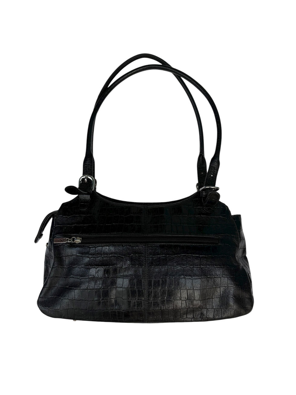 「MAXX NEW YORK」のクロコ型押しバッグです。光沢のあるブラックレザー調素材が上品で、シンプルながら存在感を引き立てます。肩掛けしやすいダブルストラップ仕様で、デイリーにもフォーマルにも活躍するアイテムです。