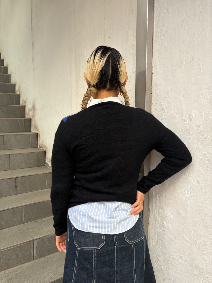 ブラックベースにブルー×グレーのアーガイル柄が映え、程よくカジュアルで洗練された印象。