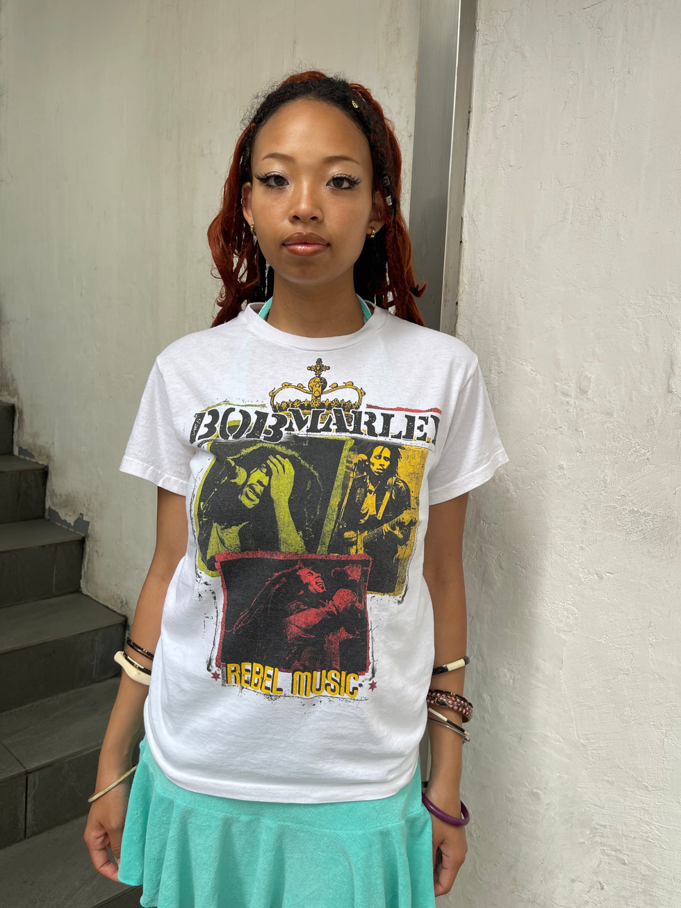 レゲエ界のレジェンド、Bob Marleyの存在感あふれるフォトグラフィックがプリントされた1枚。“REBEL MUSIC”の文字が彼のメッセージ性を体現し、ラスタカラーが効いたアートワークが印象的。ZION ROOTSWEAR製で、音楽とカルチャーを感じるヴィンテージスタイルにぴったり。