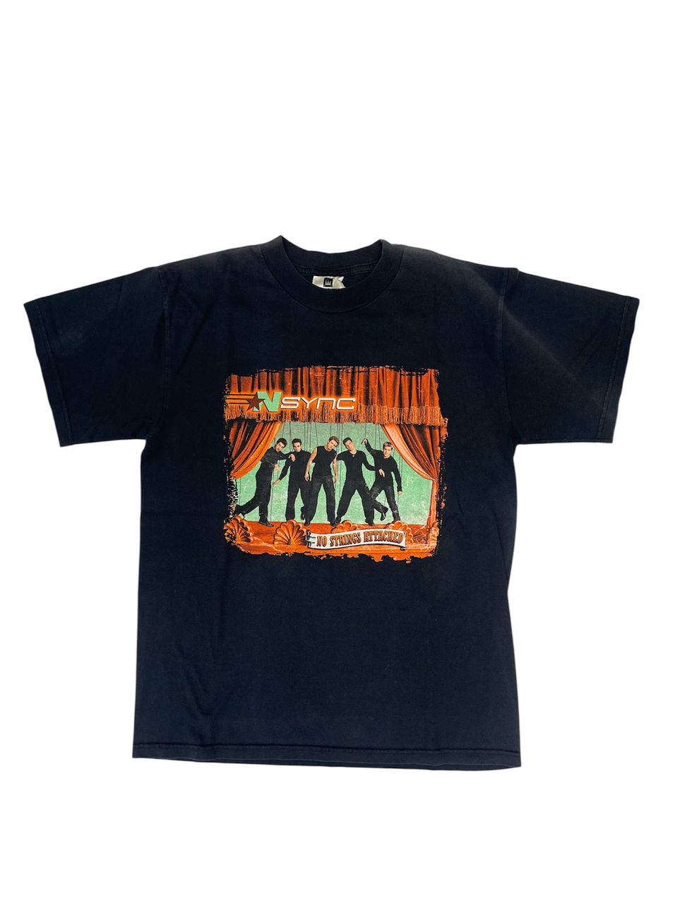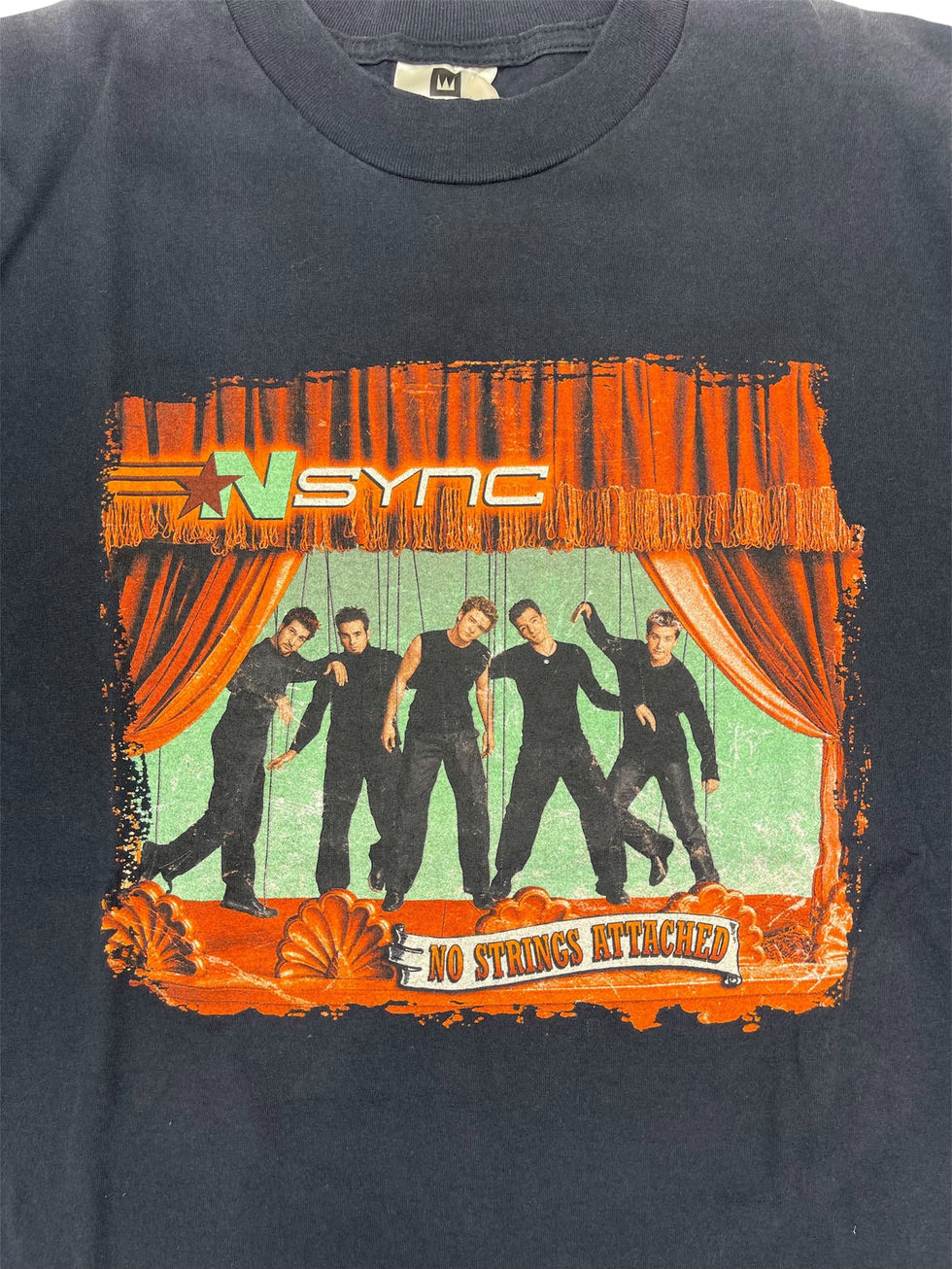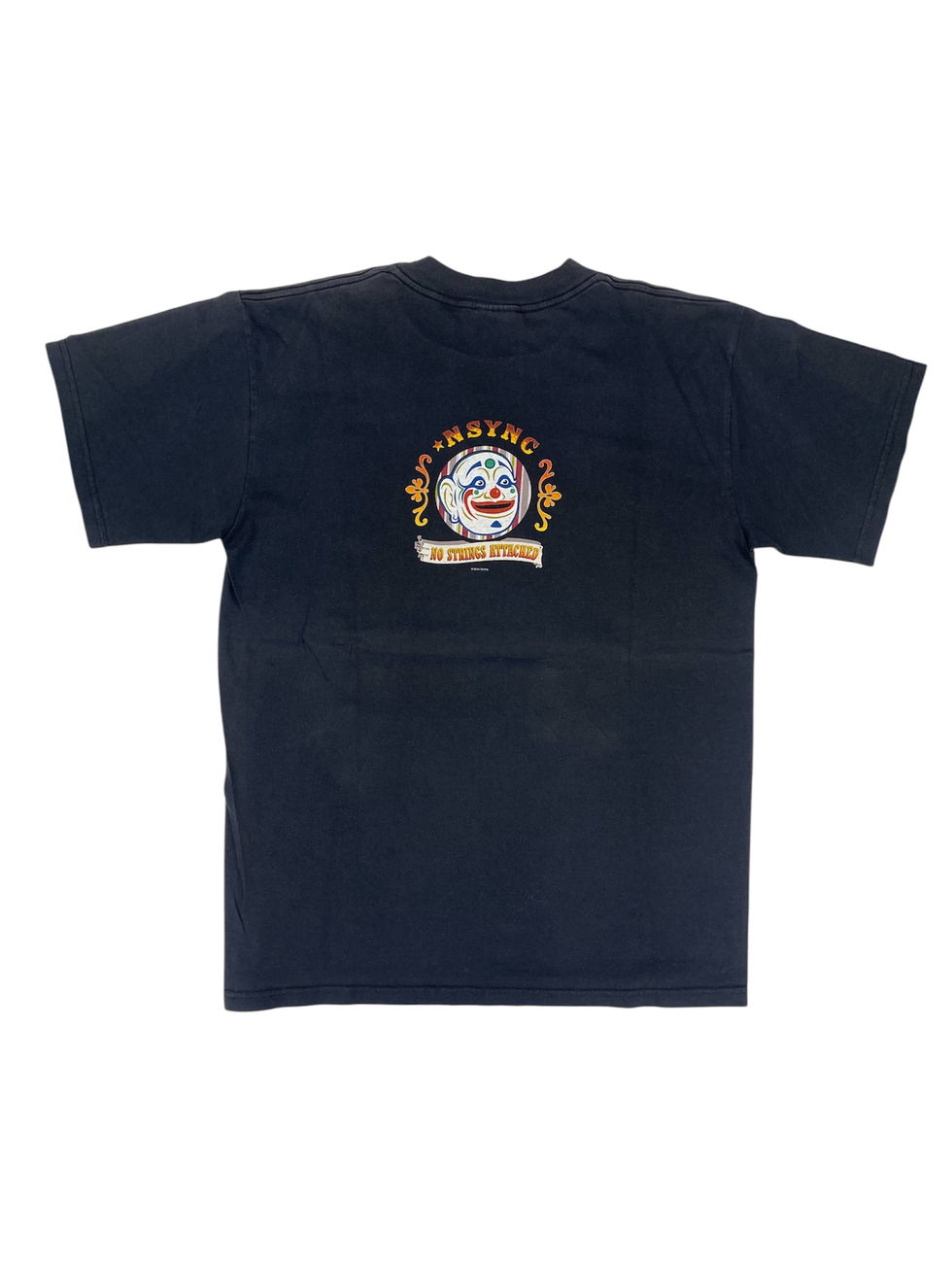 2000年代ポップシーンを席巻したボーイズグループ、*NSYNCの2000年に発売されたアルバム『No Strings Attached』Tシャツ。フロントには劇場風のシルエットアート、バックにはピエロモチーフのグラフィック入りで、遊び心満載のデザイン。