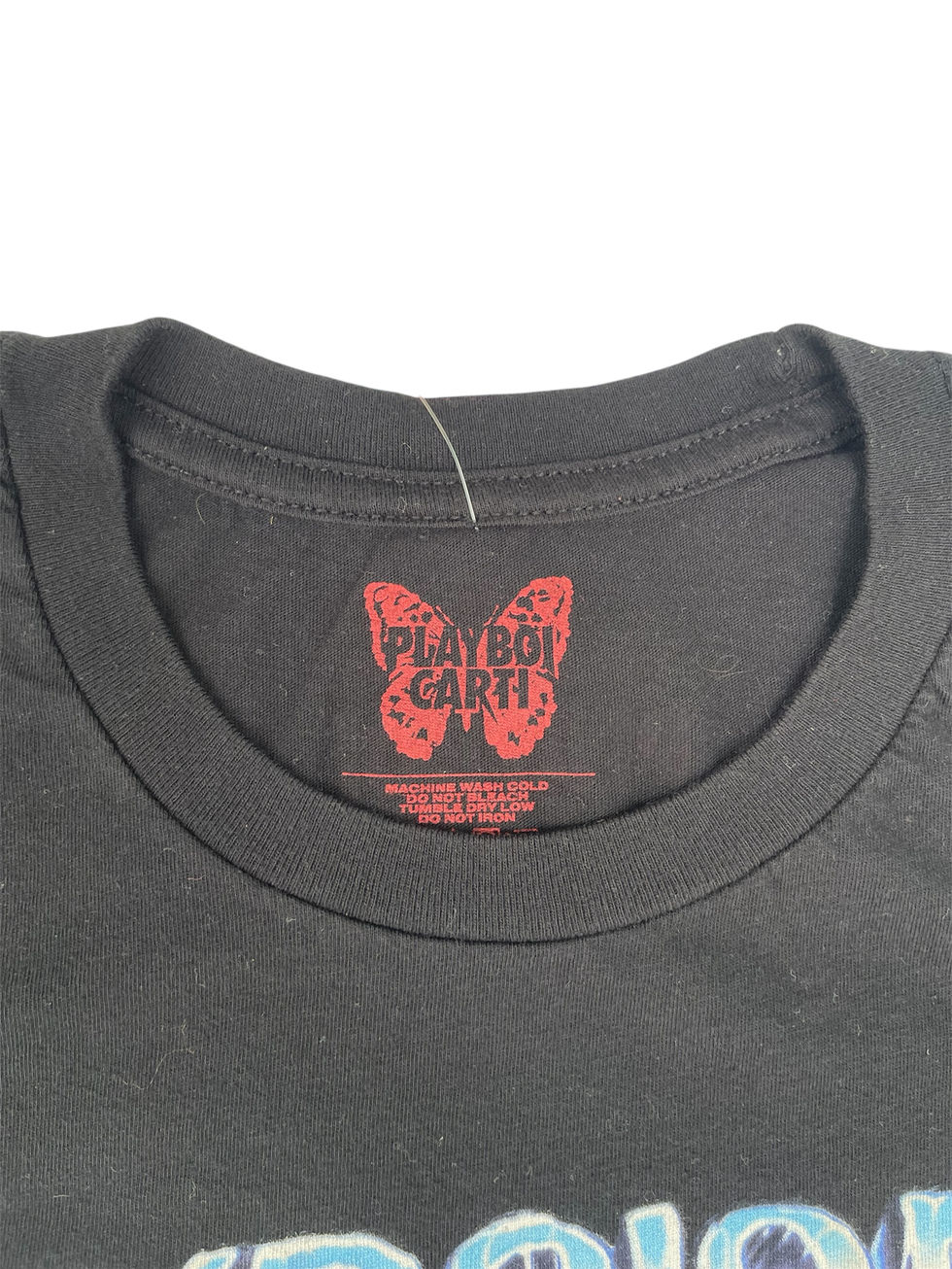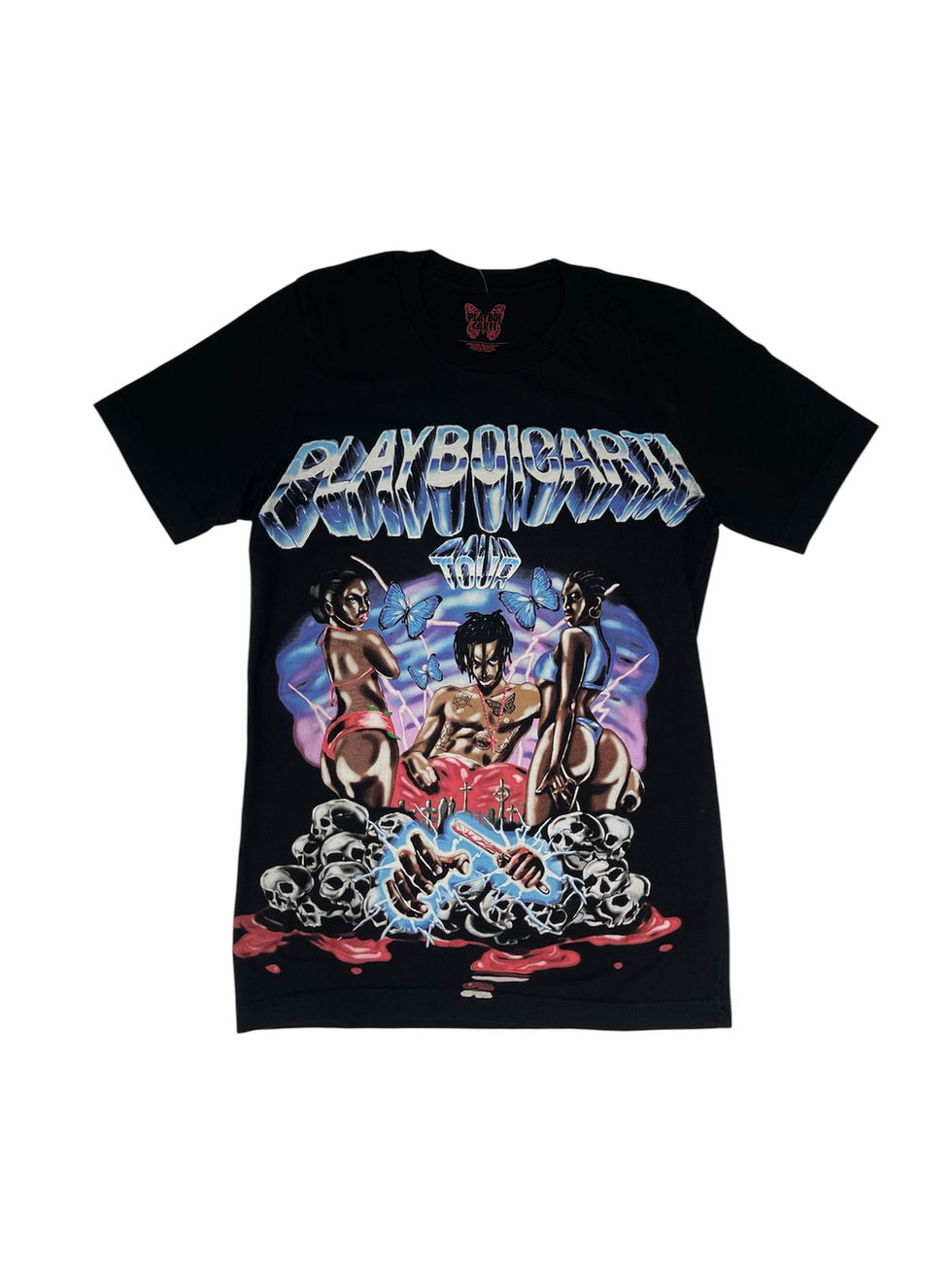 Playboi CartiのツアーTシャツ。Carti らしいグラフィックと、スカルやバタフライ、フロントのアートワークが放つ世界観が圧倒的。バックにはツアースケジュールがずらりと並び、ファンも飛びつくコレクターズアイテム。ストリートに映える1枚。