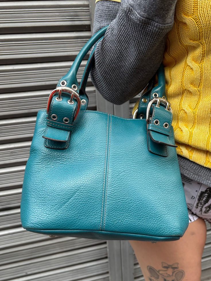 ターコイズカラーのレザーを使用したミニハンドバッグ。