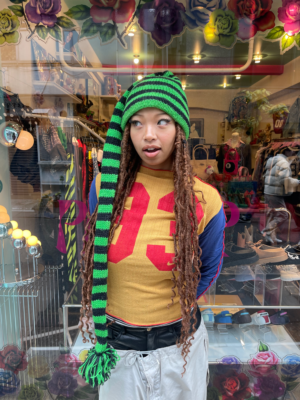 レトロな雰囲気が魅力のパイロットハットを、Y2Kスタイルに落とし込んだ一点。
