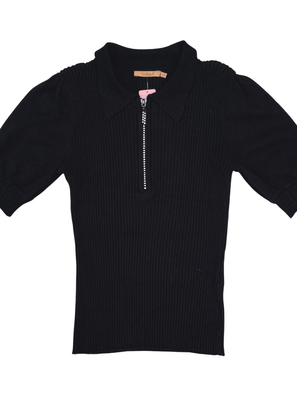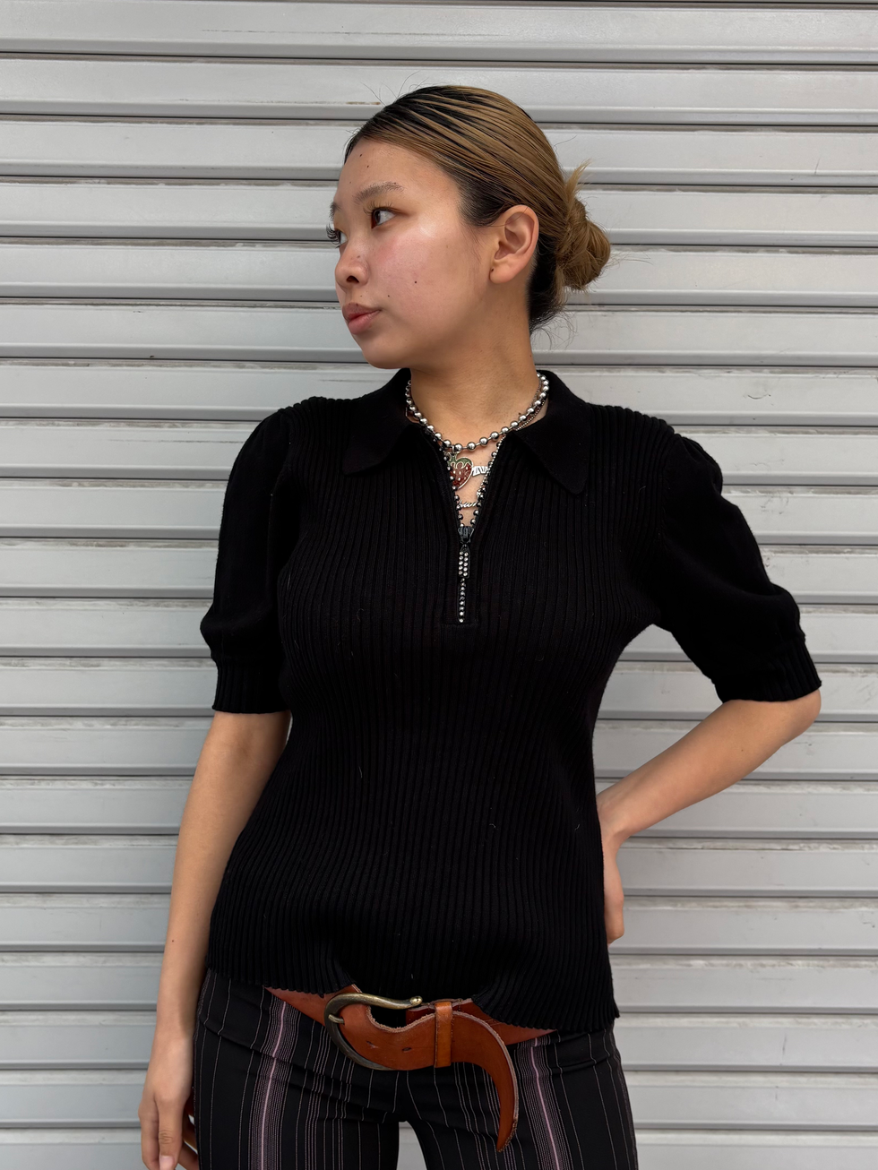 ハーフジップの部分 にラインストーンが施されているのがポイント。また、パフスリーブが上品な印象です。
