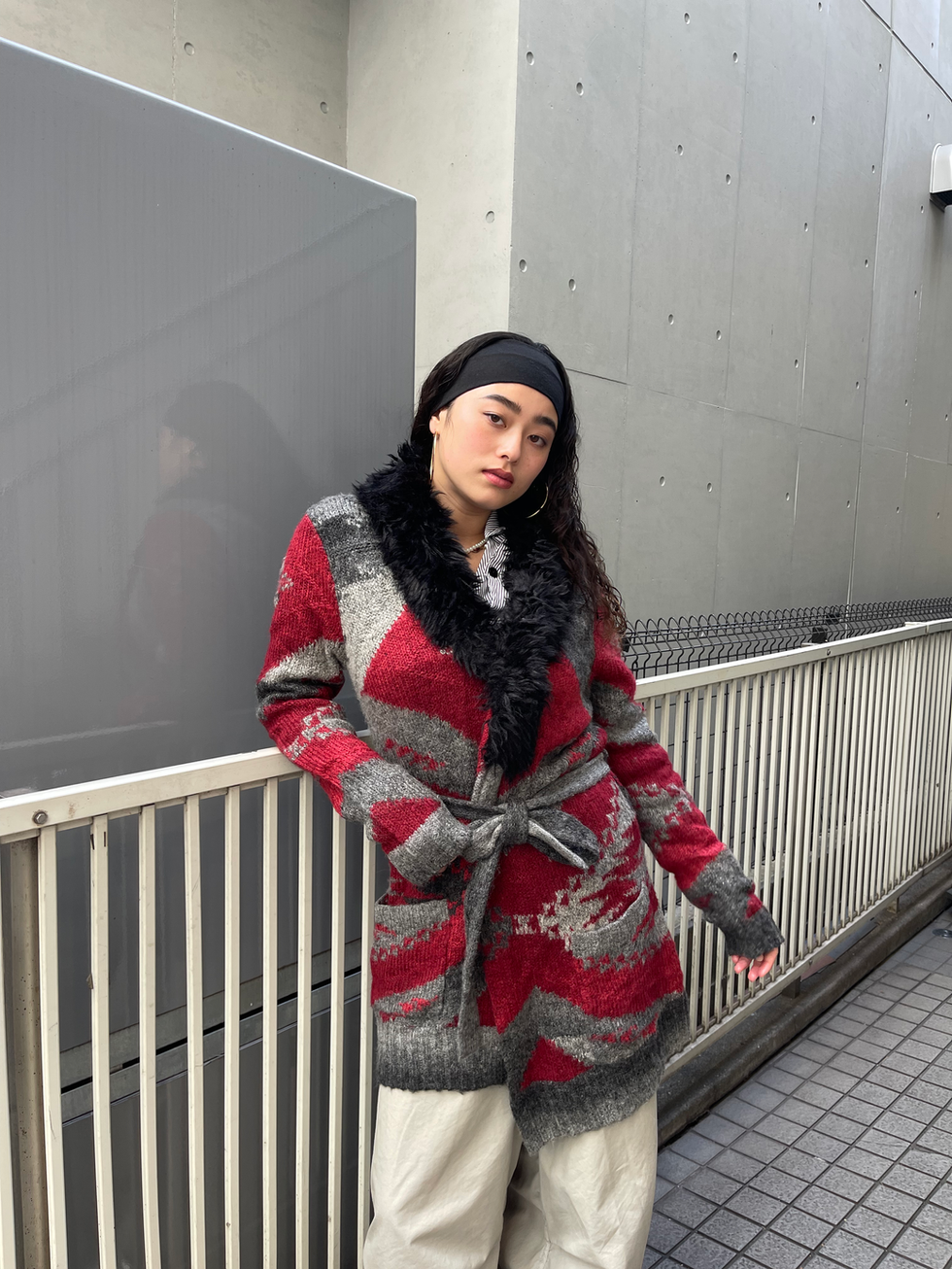 存在感のあるネイティブ柄とふわふわのファー襟がポイントのガウンカーディガン。