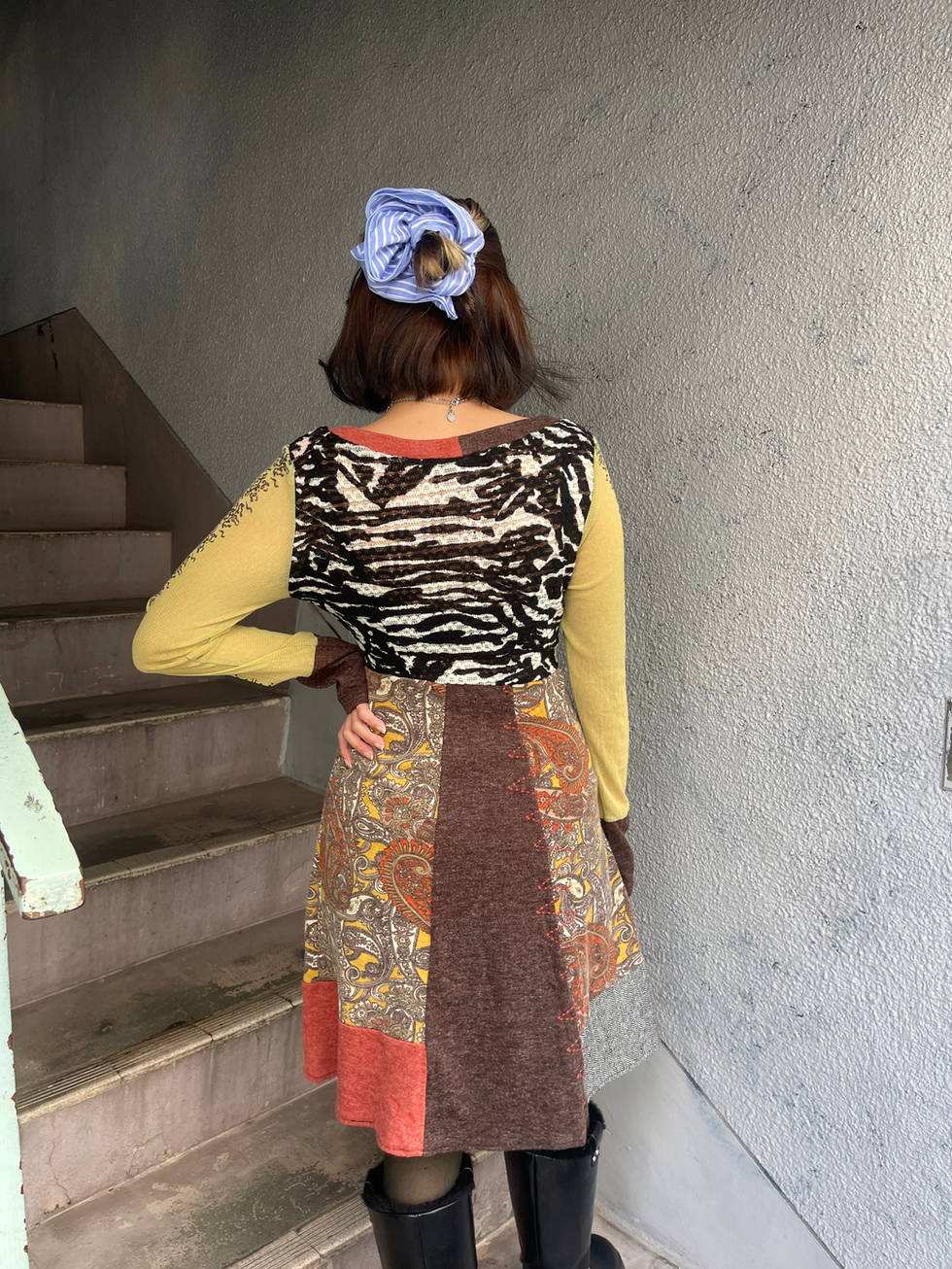 パッチワークのような配色と柄使いが目を惹くヴィンテージデザインドレス。