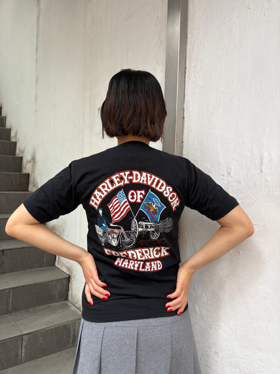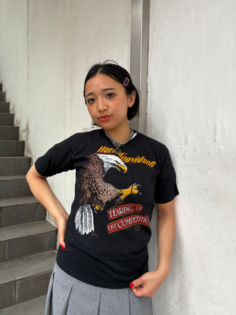 アメリカンカルチャーを象徴するモーターサイクルブランド、Harley-DavidsonのグラフィックTシャツ。フロントには迫力あるイーグルモチーフとロゴが大胆にプリントされておりインパクトのある1着。ボディはJerzeesを使用しており©︎1985のアイテム。一点物のヴィンテージ好きにおすすめの1着です。