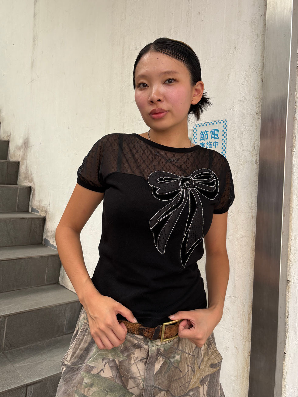 ブラックベースに大きなリボン刺繍が映え、可愛らしさと上品さを両立。