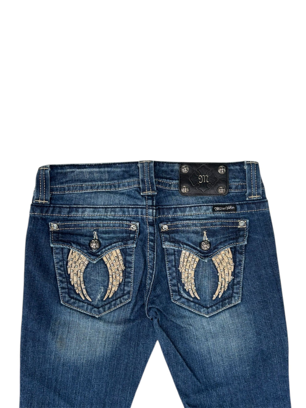 大胆なステッチやバックポケットの刺繍、ストーン装飾が特徴で、Y2Kらしい雰囲気にぴったりなアイテムです。