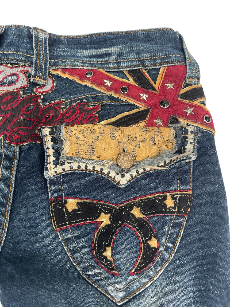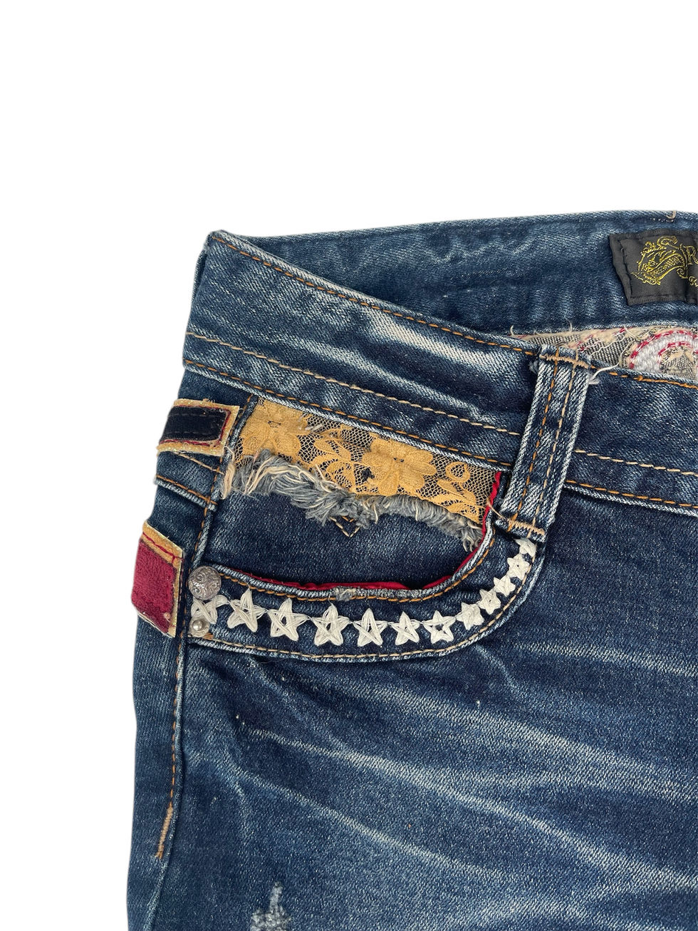 大胆なウォッシュ加工と立体的な刺繍が特徴で、当時のY2Kギャルカルチャーを象徴する一本。