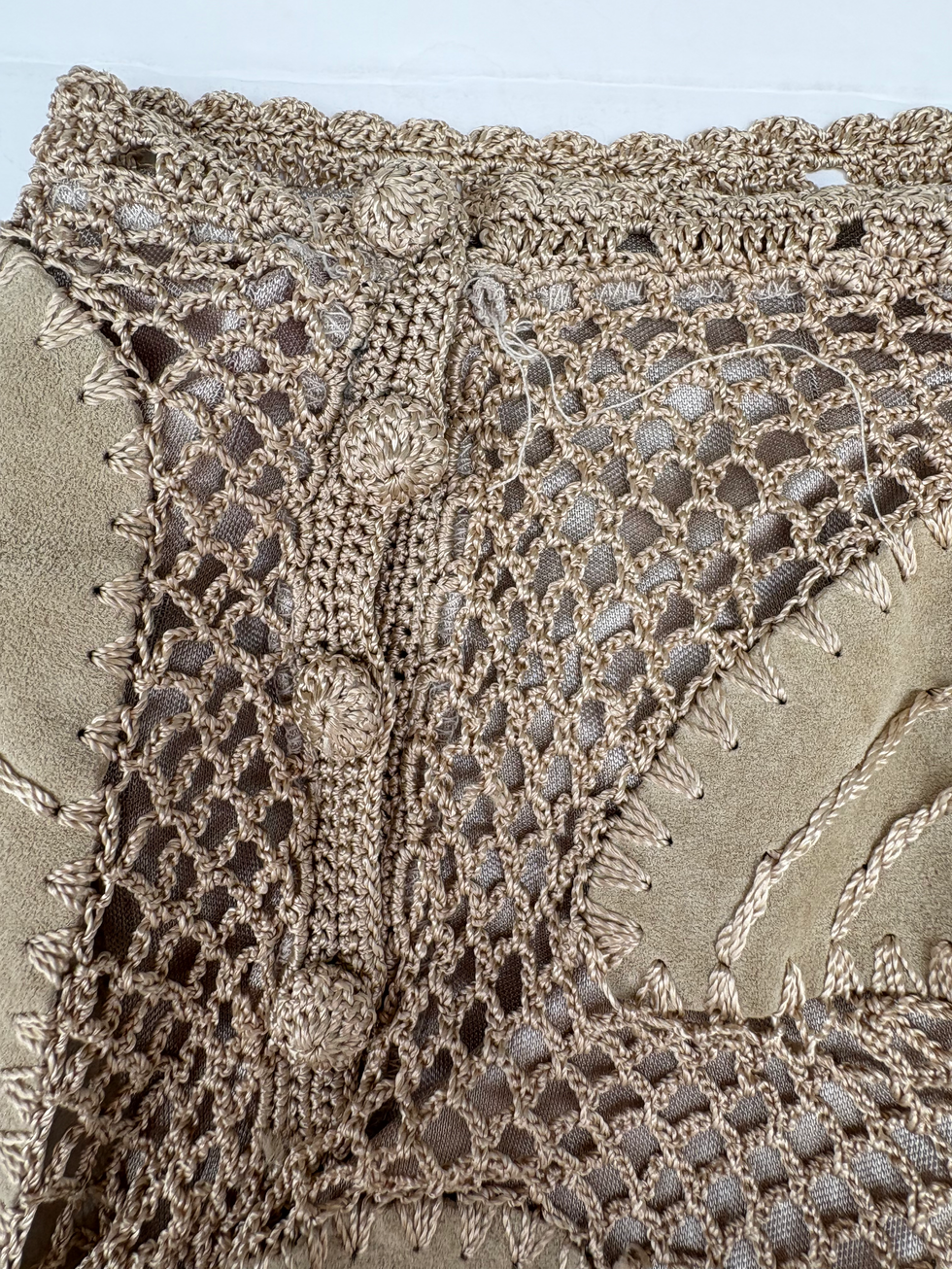 本革がクロシェ編みで繋げられたユニークなスカート。