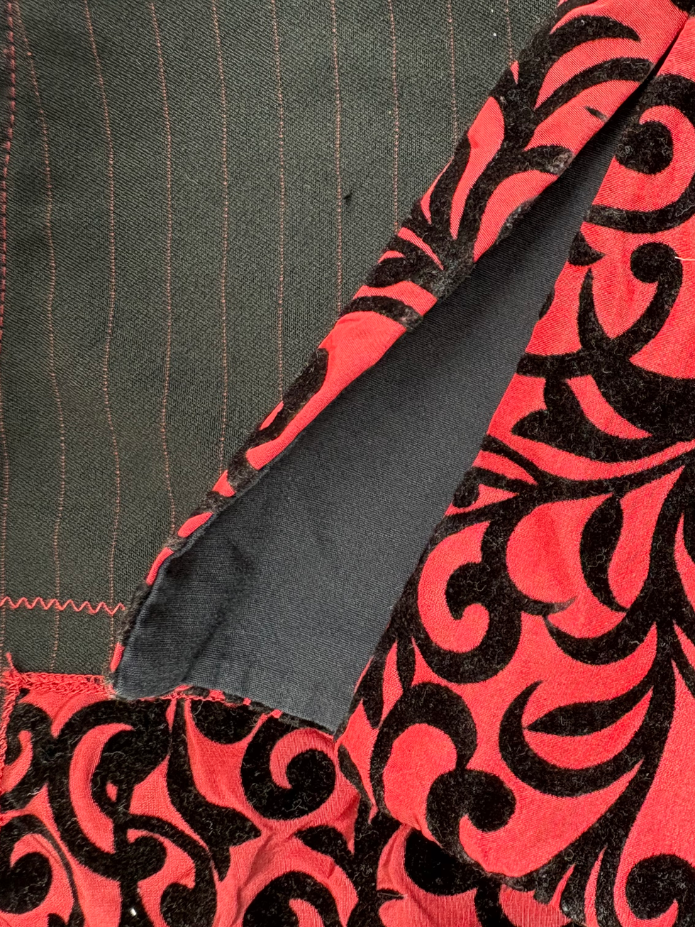 黒の唐草模様はフワフワとした素材で、右胸の赤ラインは毛糸が縫い込まれています。