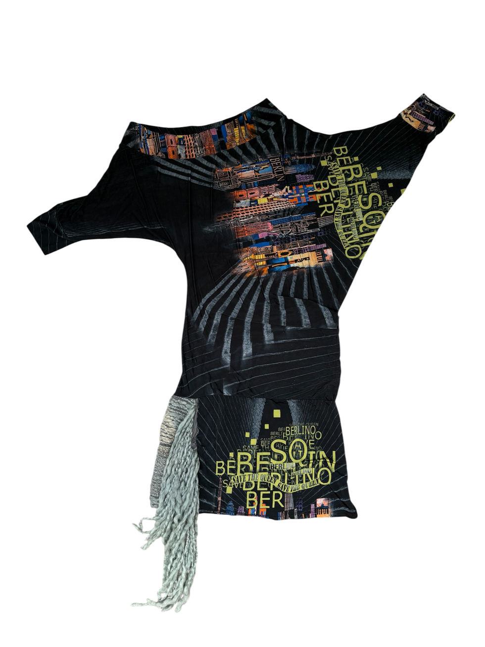 ワンショルダーのデザインで、高層ビルが立ち並ぶ夜景風のプリントがインパクトのあるドレス。