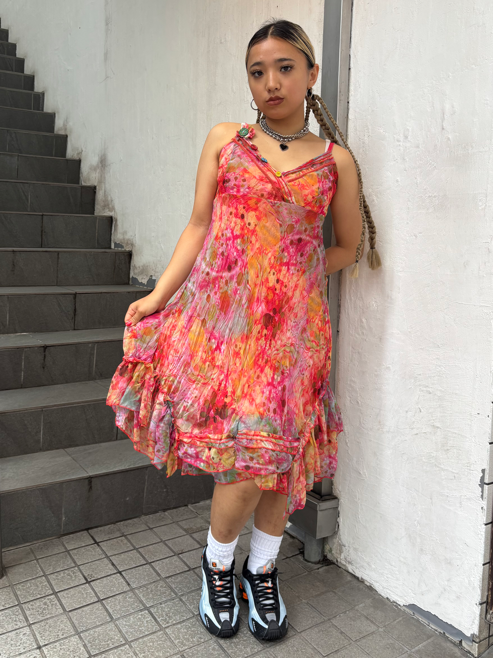 カラフルなデザインが特徴的なミディ丈ワンピース。