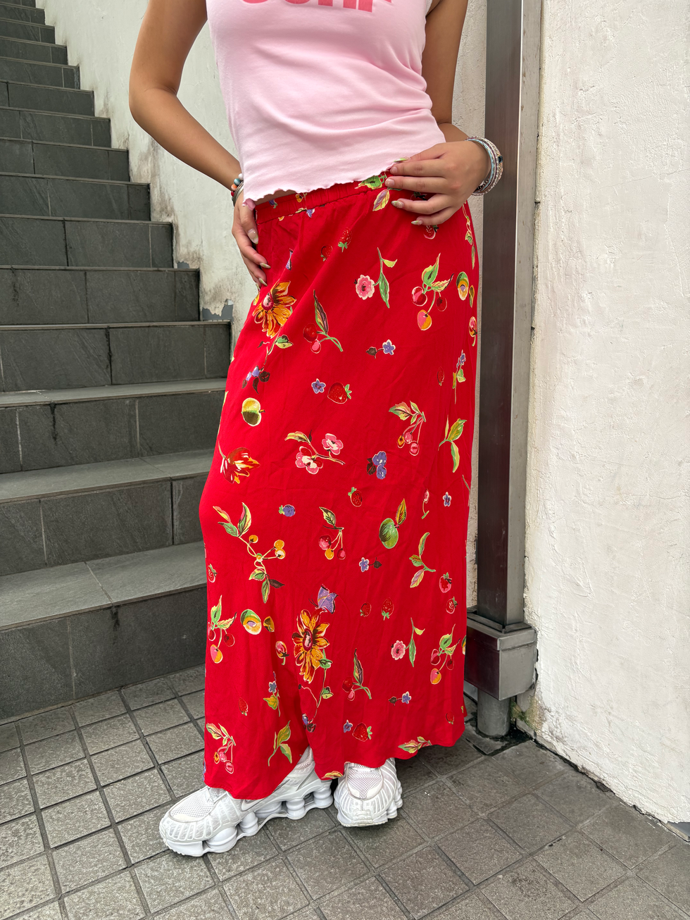 「Carol Anderson Collection」の鮮やかなフラワープリントスカート。深みのあるレッドに色とりどりの花やフルーツ柄が映え、華やかさと遊び心をプラスされた一枚。軽やかな素材感で着心地も抜群。