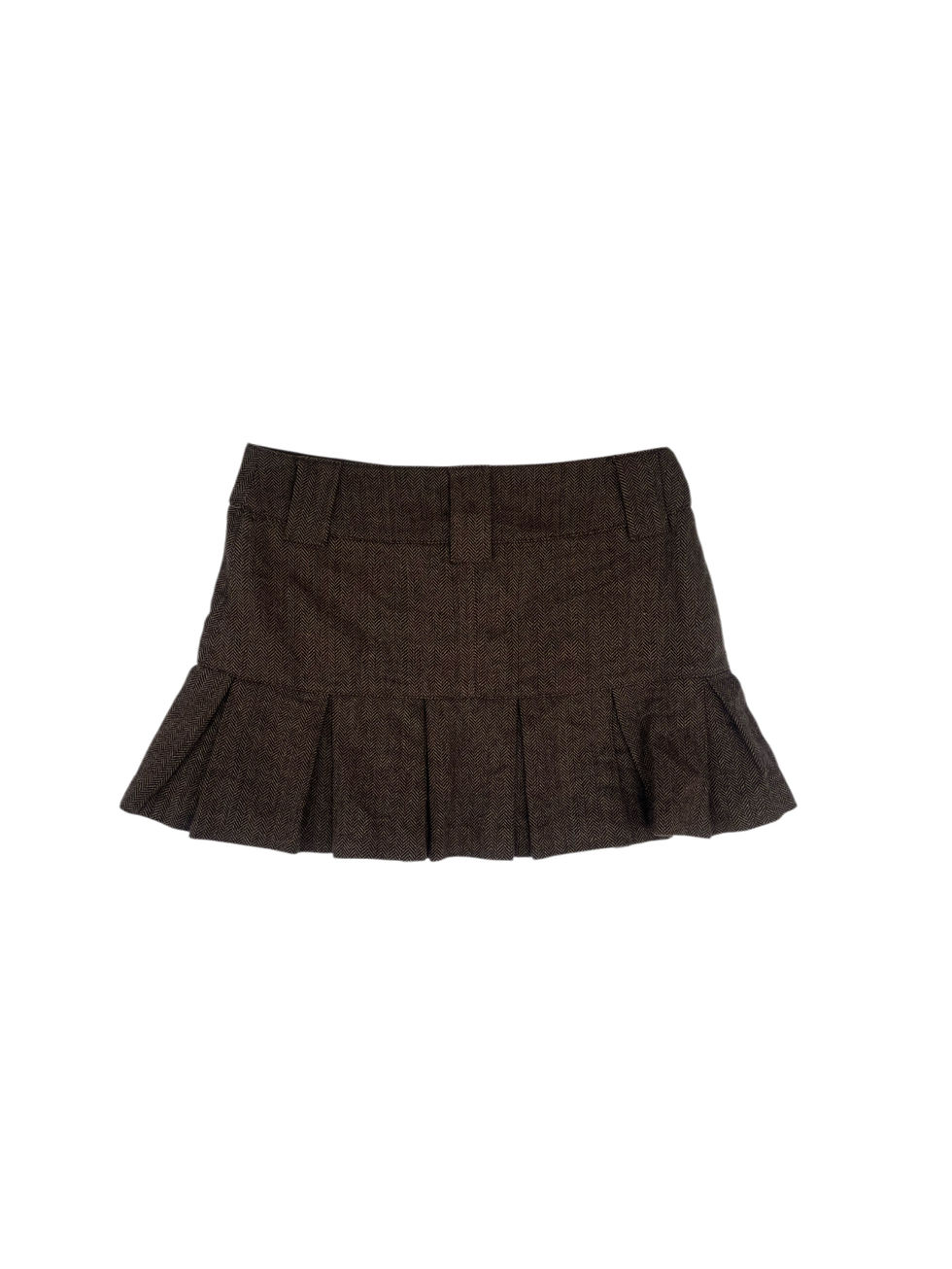クラシックなプリーツシルエットが美しいブラウンミニスカート。