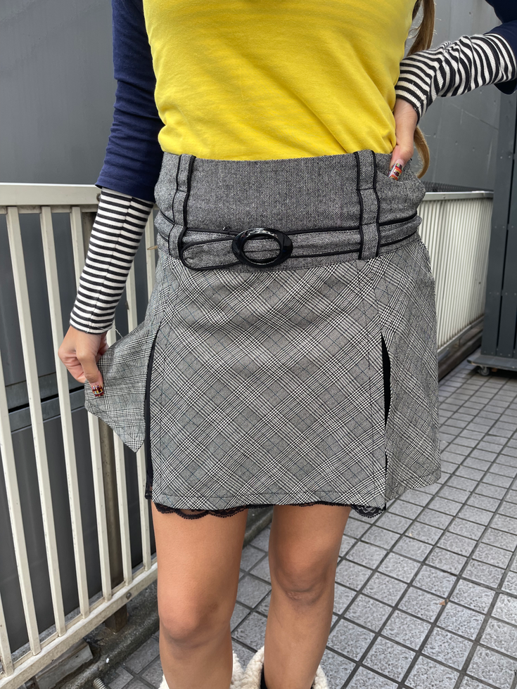 クラシカルなチェック柄×ウエストベルトデザインが上品な印象のミニスカート。