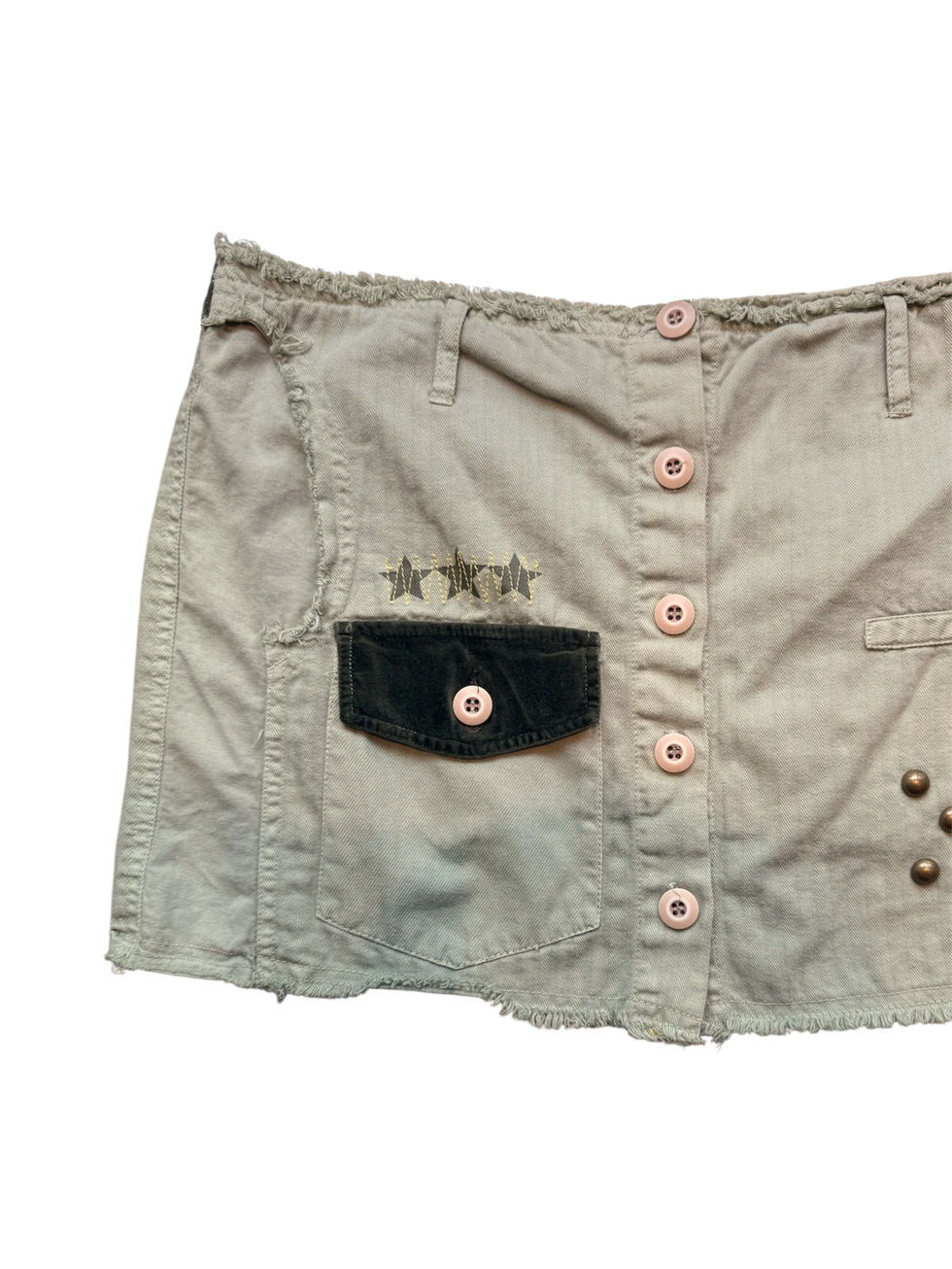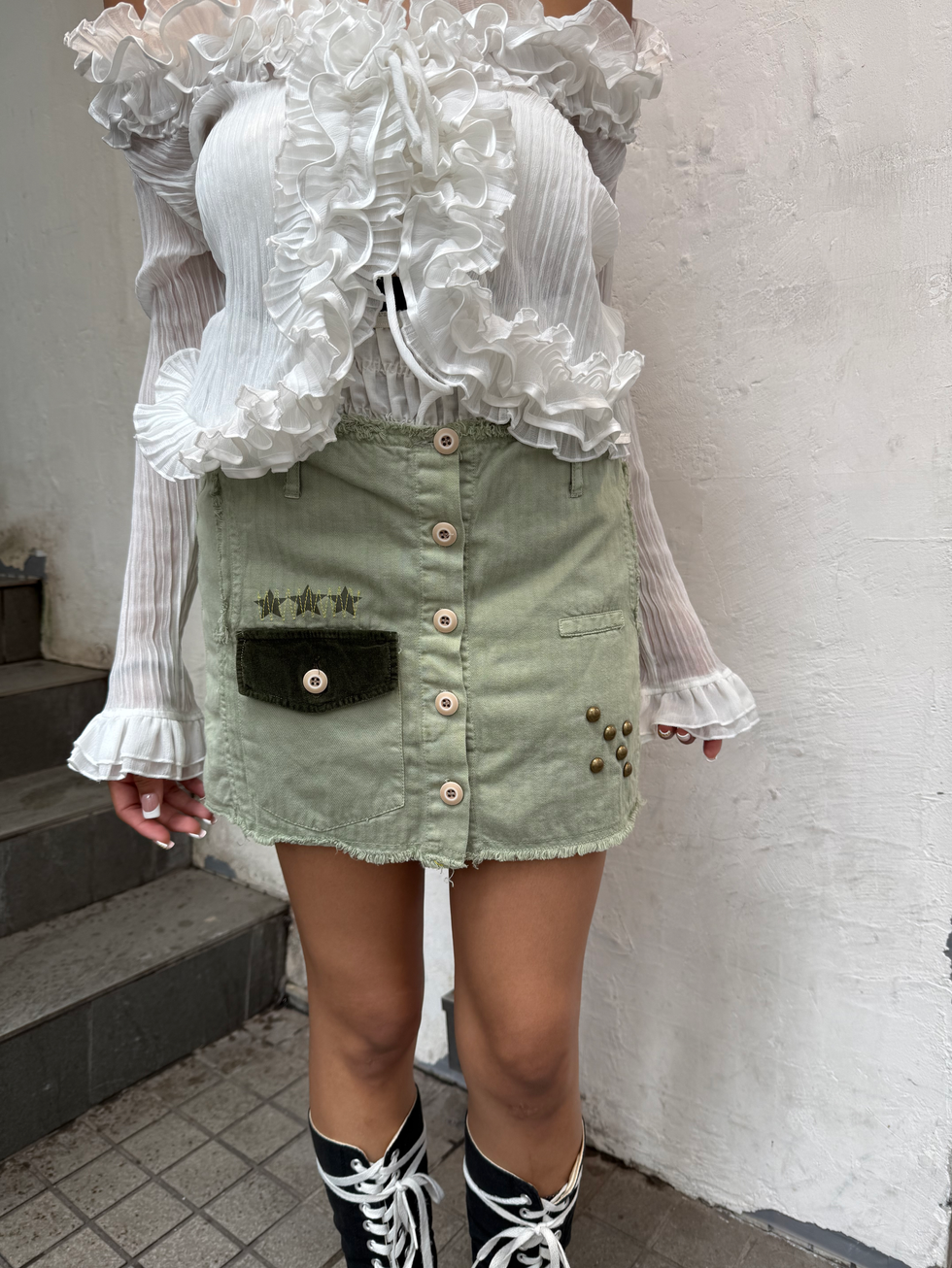 イタリア発、ミリタリーとデニムのカジュアル感を融合させた AIRFORCE CARE LABEL のデザインスカート。ボタンやポケット、星形の刺繍が印象的なアクセントに。ヴィンテージライクな色落ち加工がこなれ感を演出し、日常から特別なシーンまで活躍する一枚。