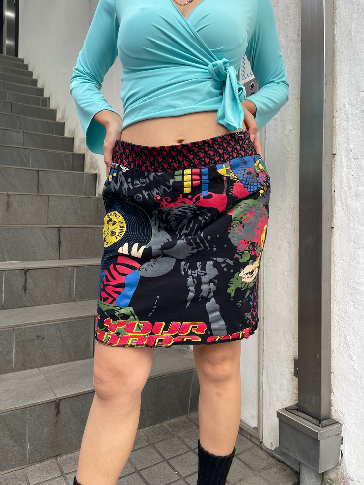 ポップなグラフィックとカラフルな配色が目を惹く Missing Johnny のデザインスカート。