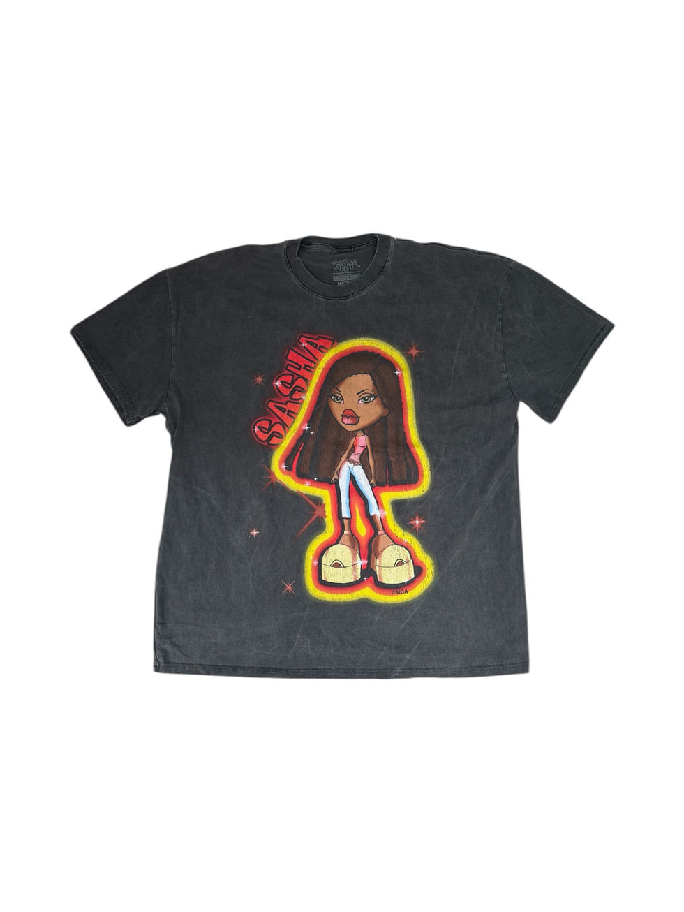 2000年代初頭、Barbieに対抗する存在として世界的なヒット商品となったBratzドールのアイコンキャラクター"Sasha"が大きくプリントされた1着。フェード感のあるブラックボディがヴィンテージライクな雰囲気を演出し、1枚でしっかり主役になるデザインです。ゆったりとしたサイズ感でワンピース風に1枚でも着用出来ます。
