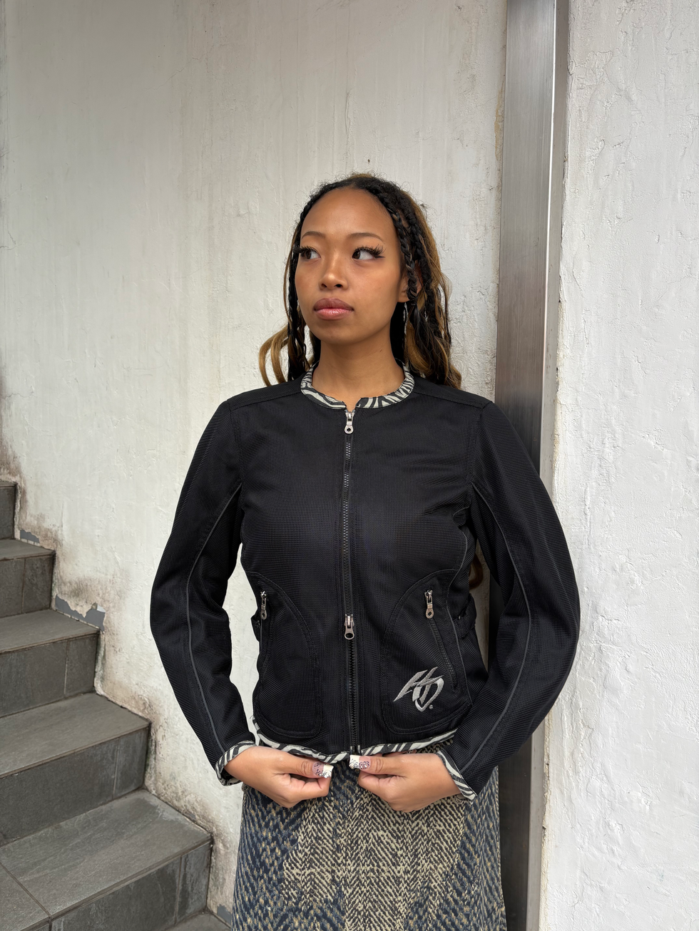 シルバージップが映えるブラックメッシュのHarley Davidsonジャケット。軽やかな着心地ながらもエッジの効いたデザインで、ワンピースやデニムの上からさらっと羽織るだけでクールな印象に。ブランドらしいロゴ刺繍がアクセントになった一枚。